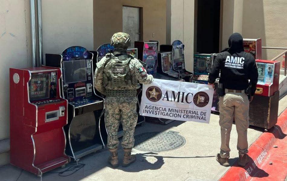 Cajeme, Sonora, 1 de Julio de 2025.- En seguimiento a actos de investigación y reconocimiento estratégico, personal de la Agencia Ministerial de Investigación Criminal (AMIC) y efectivos de la Secretaría de la Defensa Nacional (DEFENSA) aseguraron 11 máquinas tragamonedas colocadas de forma irregular frente a establecimientos comerciales en Ciudad Obregón.