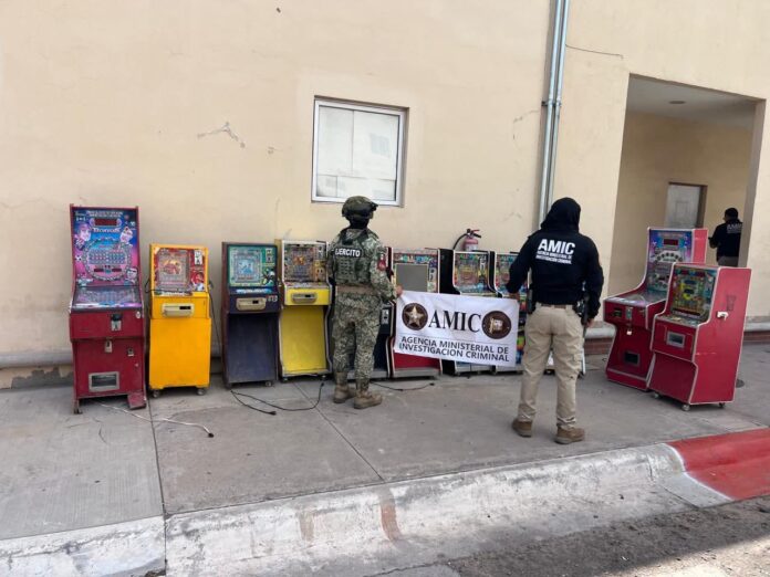 Cajeme, Sonora, 7 de julio de 2025.- La Agencia Ministerial de Investigación Criminal (AMIC) en coordinación con efectivos de la Secretaría de la Defensa Nacional (DEFENSA), aseguró 15 máquinas tragamonedas instaladas de manera ilegal en 10 pequeños comercios ubicados en diferentes sectores de Ciudad Obregón.