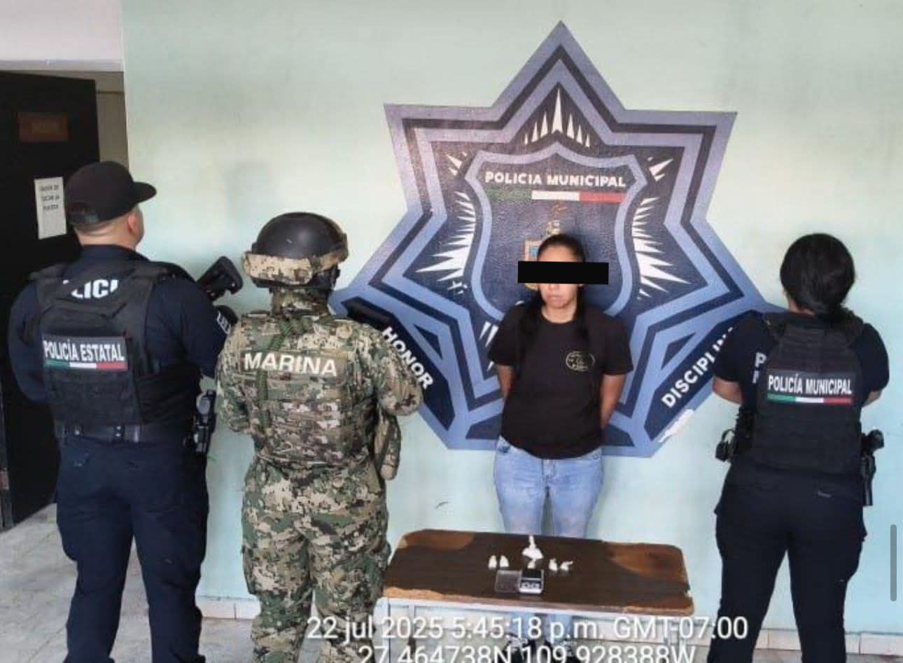 Cajeme, Son.- Elementos de la Secretaría de Seguridad Pública Municipal (SSPM) realizó la detención de una mujer por la presunta posesión de dosis de droga, como parte de las labores de vigilancia y combate al delito.