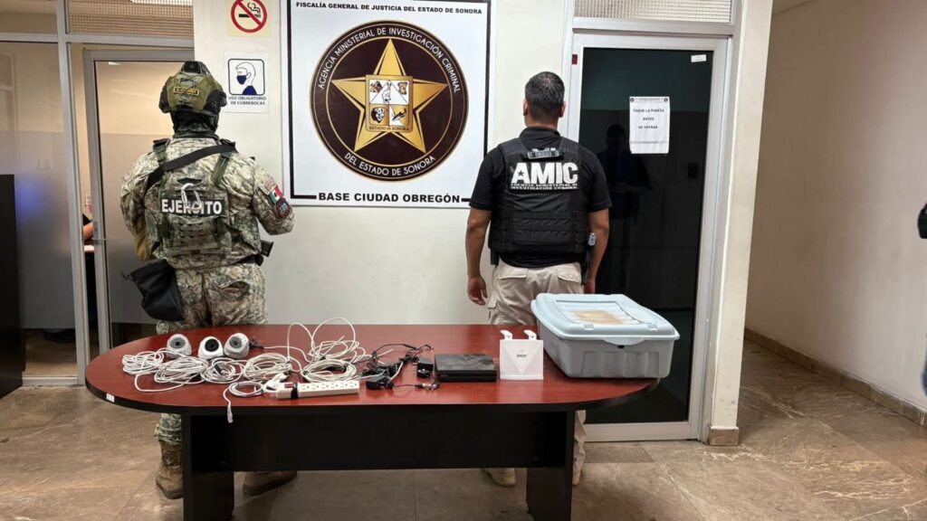 Cajeme, Sonora, 31 de julio de 2025.- La Agencia Ministerial de Investigación Criminal (AMIC), coordinación con la Secretaría de la Defensa Nacional (SEDENA), llevaron a cabo acciones operativas en la colonia Centro, donde fueron aseguradas tres cámaras de videovigilancia instaladas de manera irregular en la vía pública, así como equipo asociado utilizado para su funcionamiento.