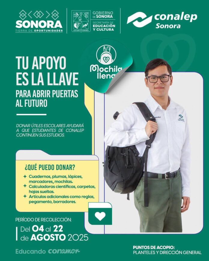 Hermosillo, Sonora; 6 de agosto de 2025.- Con la finalidad de fomentar la generosidad y el altruismo en beneficio de sus alumnos, el Gobierno de Sonora, a través del Colegio de Educación Profesional Técnica del Estado de Sonora (Conalep Sonora) invita a participar en el programa “Mochila Llena: Educando CONAmor”.