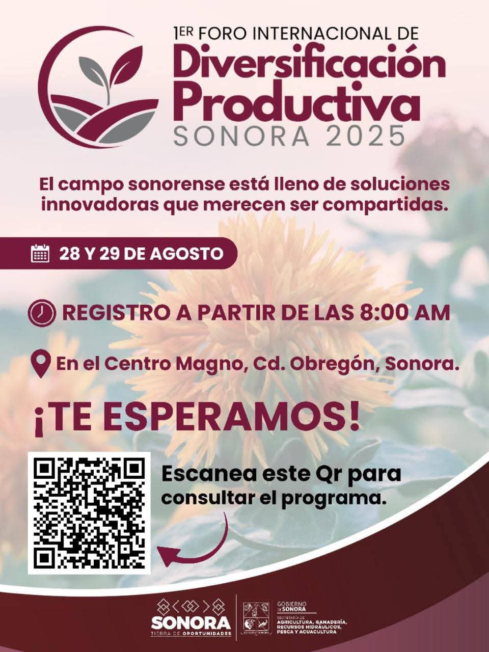 Hermosillo, Son.- Para impulsar la reconversión agrícola, la innovación tecnológica y la diversificación productiva como ejes estratégicos frente a los retos del cambio climático, se llevará a cabo el Primer Foro Internacional de Diversificación Productiva, en Cajeme.
