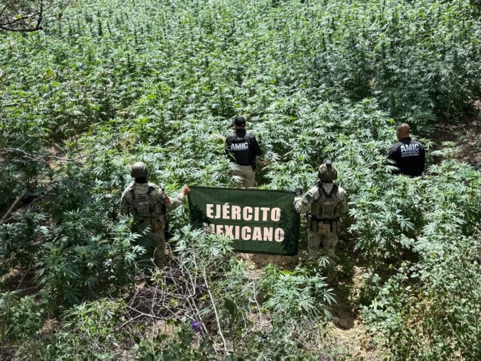 Cananea, Sonora, 9 de septiembre de 2025.- La Fiscalía General de Justicia del Estado de Sonora (FGJES), por medio de la Agencia Ministerial de Investigación Criminal (AMIC), en coordinación con la Secretaría de la Defensa Nacional (DEFENSA), logró la localización y destrucción de un plantío ilegal de marihuana en las inmediaciones del Puerto de Cananea.
