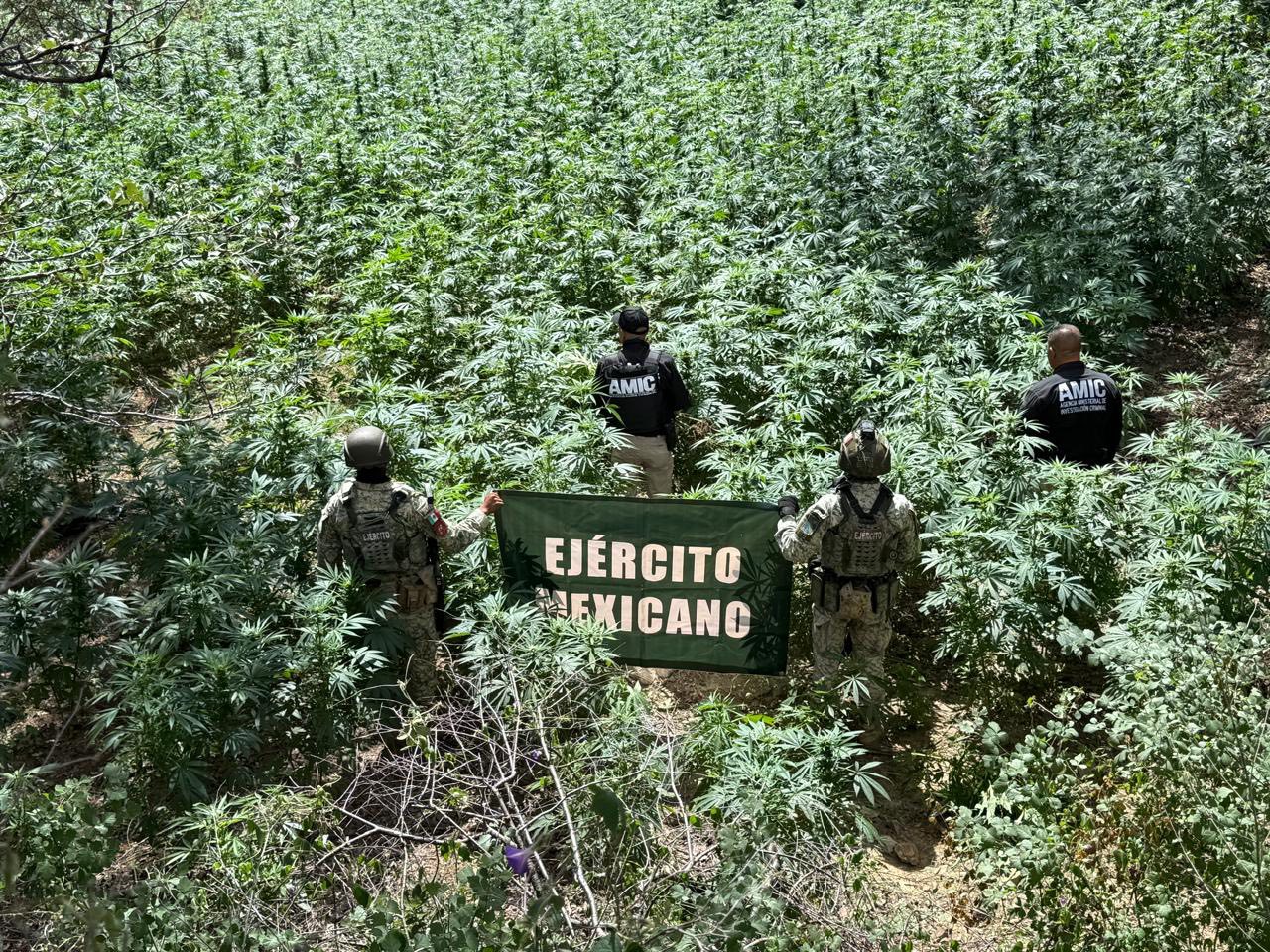En estas acciones, se localizó un predio de aproximadamente mil 189 metros cuadrados, donde se encontraron plantas con características físicas propias de la marihuana que presentaban una densidad promedio de seis a siete plantas por metro cuadrado y una altura aproximada de 1.50 metros, lo que corresponde a un estimado de 8 mil 300 plantas.