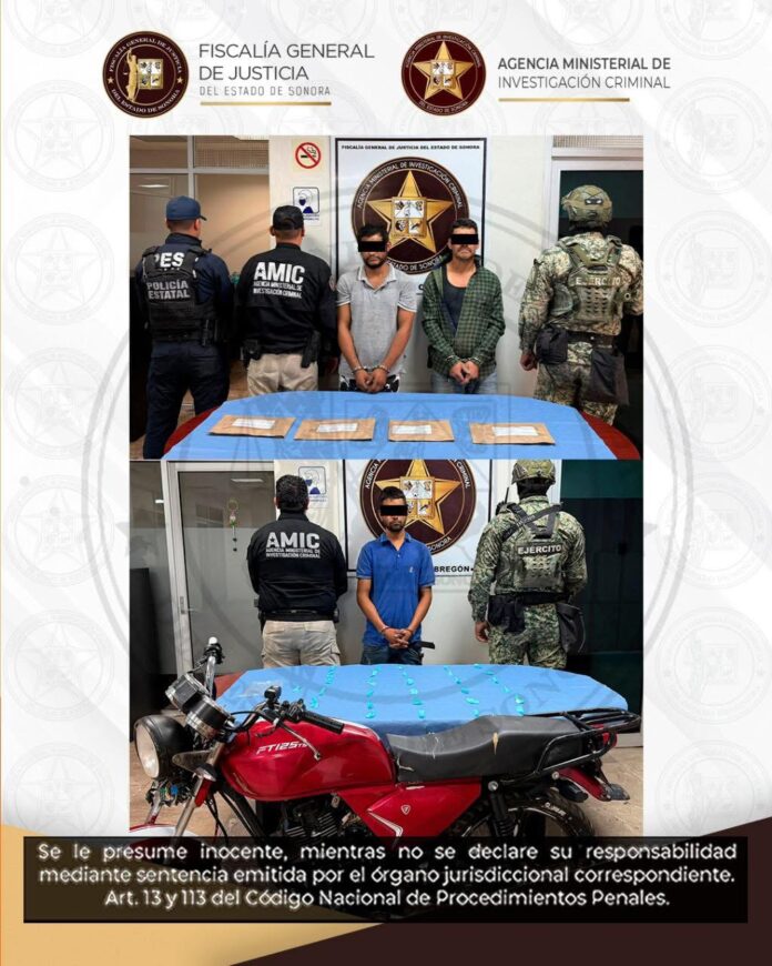Cajeme, Sonora, 11 de diciembre de 2025.- La Fiscalía General de Justicia del Estado de Sonora (FGJES) informa sobre la realización de dos operativos distintos en Ciudad Obregón, llevados a cabo en coordinación con la Agencia Ministerial de Investigación Criminal (AMIC), la Policía Estatal de Seguridad Pública (PESP) y la Secretaría de la Defensa Nacional (DEFENSA); los resultados incluyen la detención de tres personas por narcomenudeo y el aseguramiento de dosis de droga y un vehículo.